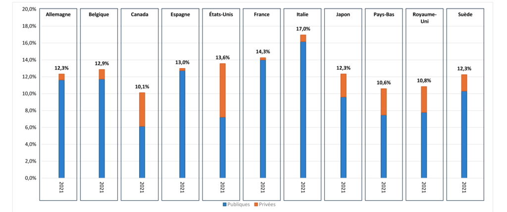 Part des dépenses (publiques et privées) dans le PIB dans les pays suivis par le COR en 2021