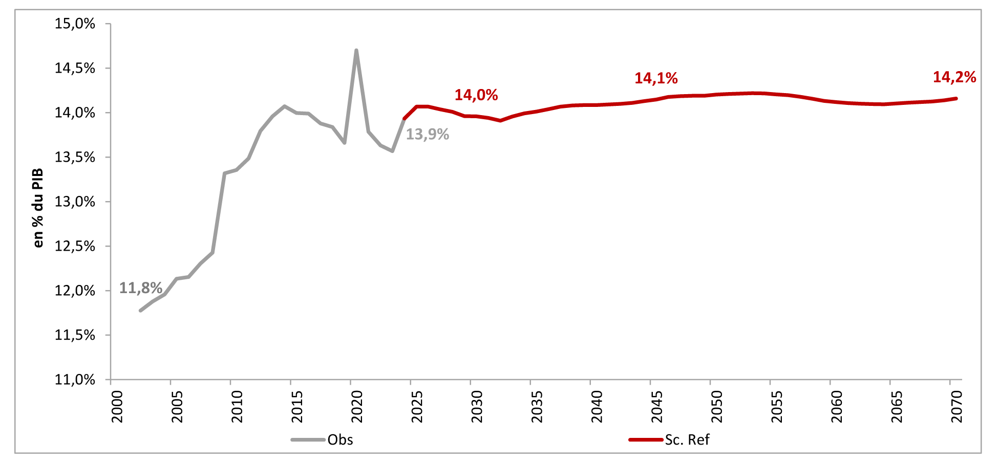 La part des dépenses de retraite dans le PIB augmenterait légèrement dans le scénario de référence pour s’établir à 14,0 % en 2030, puis 14,2 % en 2070. Ce ratio serait plus élevé que dans le rapport annuel de 2024, sur toute la période de projection, en raison des révisions macroéconomiques intervenues depuis et du changement de scénario de référence retenu.