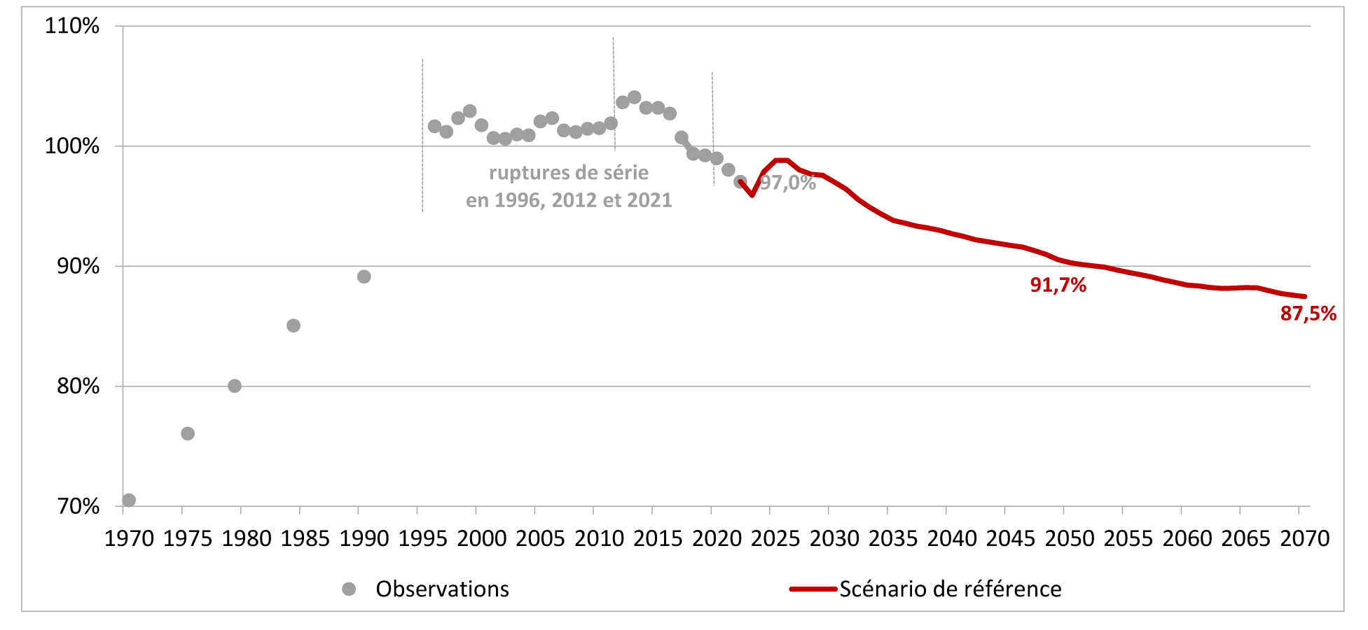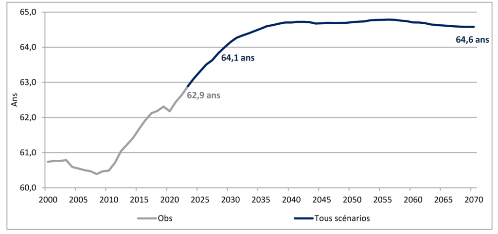 Cette évolution démographique défavorable est toutefois atténuée par les réformes qui augmentent le taux d’emploi des seniors et entraînent un recul de l’âge de départ à la retraite, ce qui diminue les dépenses de retraite : cet âge passerait de 62,9 ans en 2023 à 64,6 ans en 2070.