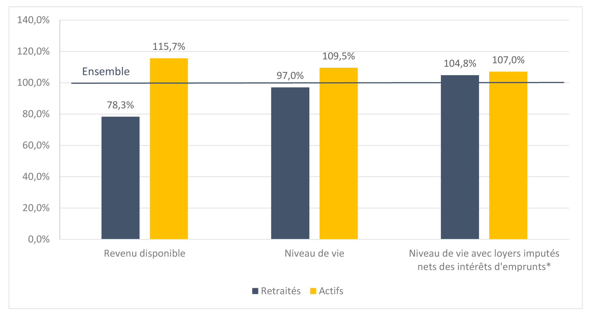 Niveau de vie individuel moyen relatif des retraités et des actifs en 2022 (100 % pour l’ensemble de la population)