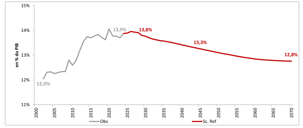 En 2024, les ressources du système de retraite se sont élevées à 13,9 % du PIB. Cette part devrait baisser à l’avenir pour s’établir à 13,8 % du PIB en 2030 et se situer à 12,8 % en 2070.