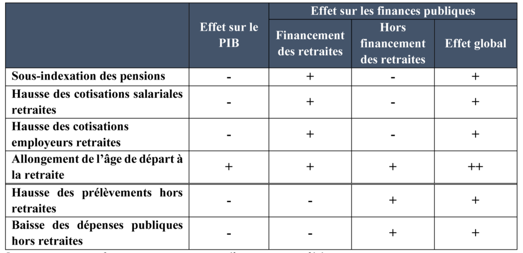 Comme l’a rappelé la Cour des Comptes dans le cadre de sa mission flash, ces différents leviers ne sont pas équivalents du point de vue de leurs effets macroéconomiques de long terme. Les trois premières de ces quatre voies sont récessives : les deux premières réduisent le revenu net et donc la demande des ménages9[9], ce qui affaiblit le PIB ; la troisième voie d’une augmentation des contributions retraites payées par les entreprises augmente le coût du travail, ce qui réduit l’investissement et l’emploi et donc aussi le PIB. L’effet récessif de ces trois voies correspond à un appauvrissement du pays (moindre PIB par habitant) et à une réduction des recettes fiscales et sociales des administrations publiques. En conséquence, ces trois voies renforcent les difficultés à financer les dépenses publiques autres que les retraites, à l’instar de l’école, la santé, la sécurité, etc. À l’inverse, la quatrième voie aboutit à augmenter l’offre de travail et donc à terme l’emploi et le PIB, et en conséquence toutes les recettes fiscales et sociales des administrations publiques au-delà des seuls prélèvements finançant les retraites. Cette quatrième voie est expansive et correspond à un enrichissement du pays (hausse du PIB par habitant). Ces différents effets sont résumés dans le tableau suivant.
