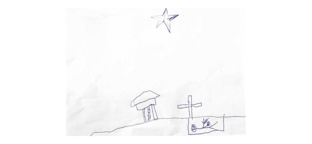 Mercredi 13 avril 2022: Dessin de Thaïs, 6 ans, venu ce matin au dispensaire pour un trouble du sommeil et agitation selon sa maman. Il a fait ce dessin à ma demande sans que je lui donne d’indication.