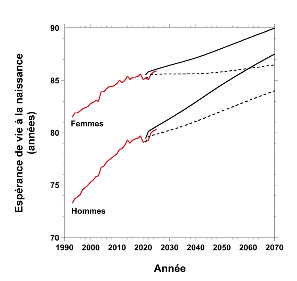 Figure 2. Espérance de vie à la naissance en France de 1993 à 2025 et projections des scenarios d’espérance de vie centrale et basse de l’INSEE de 2021 à 2070. Espérance de vie observée de 1993 à 2025 : traits rouges. Scénario central : traits continus. Scénario bas : traits discontinus. Les données d’espérance de vie de 2023 à 2025 sont provisoires (Insee Première 2087). L’espérance de vie des hommes en 2023 était estimée à 80 ans au début de 2024 (Insee Première 1978), à 79,9 début 2025 (Insee Première 2033 ) et de nouveau à 80 début 2026 (Insee Première 2087 ). Pour les femmes, ces valeurs étaient respectivement de 85,7, 85,6, et 85,6 ans. Pour l’année 2024, les estimations de 2025 et 2026 sont de 80 et 80,2 pour les hommes, et de 85,6 et 85,8 pour les femmes : cette correction importante à la hausse des deux sexes pour la même année (+0,2 année, soit plus de 2 mois) est inhabituelle, alors que d’ordinaire la correction est plutôt à la baisse et moins importante. Il semble nécessaire d’attendre que toutes les données de population soient connues pour valider les estimations provisoires de l’espérance de vie de 2023 à 2025. Pour ne donner qu’un exemple, les dernières données de l’INSEE pour 2025, publiées fin février 2026, ont diminué le nombre de décès et de naissances estimé début janvier dans Insee Première 2087, faisant passer le solde naturel négatif de 2025 de 6 000 décès de plus que les naissances à 3 755, mais cela peut encore évoluer en fonction des données inconnues fin février.