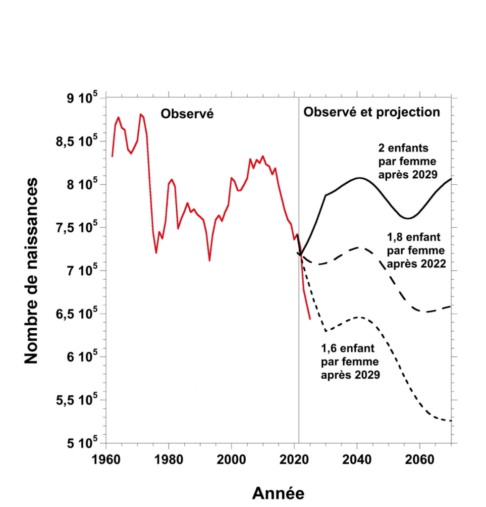 Figure 3. Nombre de naissances observé de 1962 à 2025 (trait rouge) et projections de l’INSEE dans les scénarios de fécondité haute (2 enfants par femme après 2029), centrale (1,8 enfant par femme après 2022) et basse (1,6 enfant par femme après 2029).
