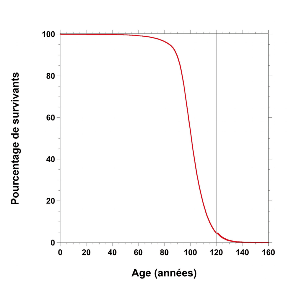Figure 1. Pourcentage de survivants en 2120 selon le scénario d’espérance de vie haute de l’INSEE. Dans ce scénario, l’espérance de vie atteint 100,8 ans en 2120 et l’INSEE ne continue pas sa projection après l’âge de 120 ans, à l’emplacement du trait vertical, alors qu’il reste encore presque 5 % de survivants. En se basant sur le taux de mortalité estime à 120 ans (15 %) et en continuant la projection en l’augmentant de 0,25% chaque année, comme dans les dernières années avant l’âge de 120 ans, le dernier survivant meurt à 159 ans.